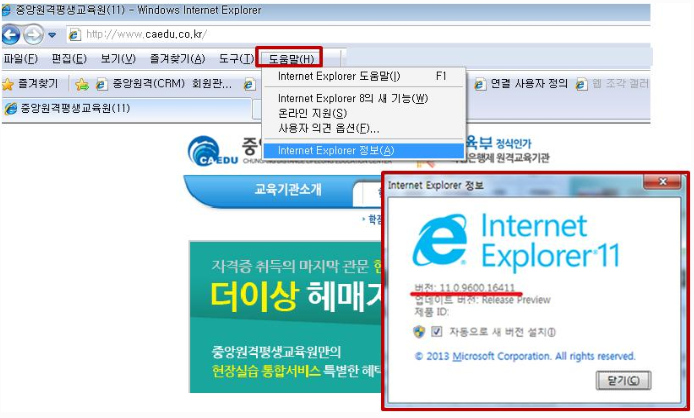 홈페이지 이용시 화면이 정상적으로 보이지 않으실 때 확인해주세요 ! 스팩토리에듀 홈페이지는 인터넷익스플로러 사용시에 11버전에 최적화 되어있습니다 인터넷익스플로러를 사용하실 경우에는 아래와 같은방법으로 버전을 확인 해주시기 바랍니다. 도움말 - 인터넷익스플로러 정보 클릭 하여 버전확인 버전이 11이 아닐경우 아래의 링크에서 11버전 다운로드가 가능합니다 https://support.microsoft.com/ko-kr/help/17621/internet-explorer-downloads